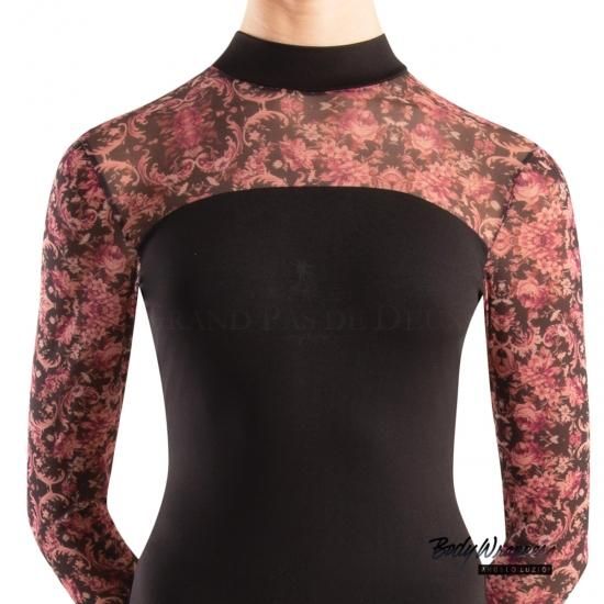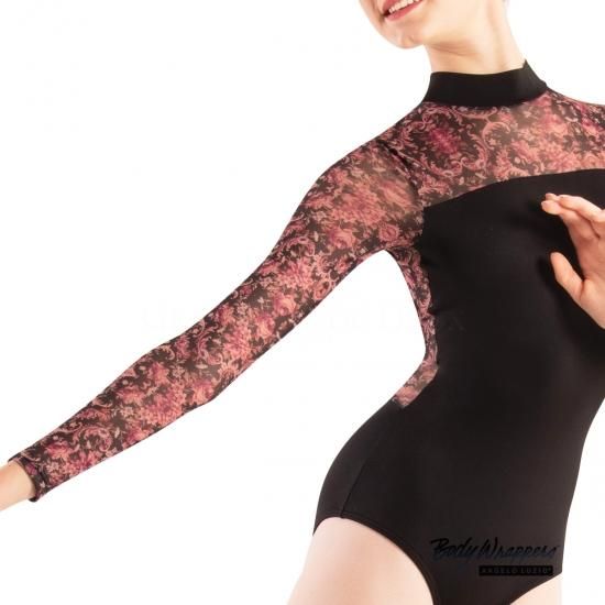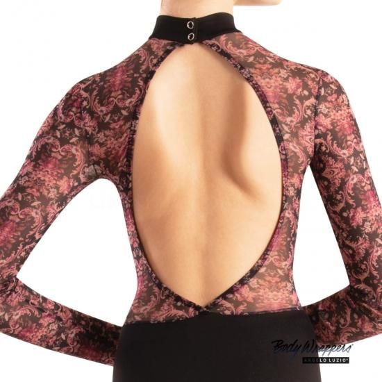 メッシュプリントが首まわり、袖から背中にかけて施された華やかなレオタード