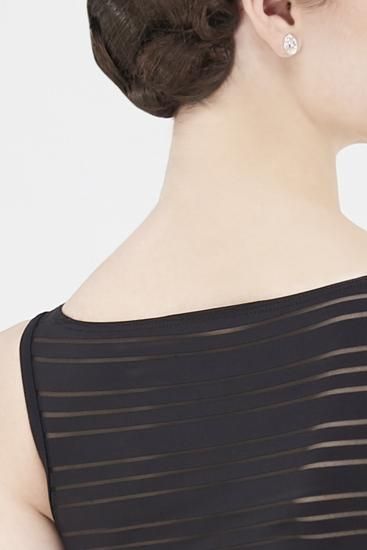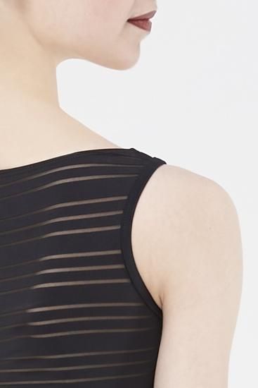 Vネックのネックラインで首回りをスッキリと魅せてくれる「ノースリーブ レオタード」は、バックにデザインされたメッシュ生地のボーダー柄がポイントです。装飾を抑えたシンプルなデザインにより大人のエレガントさを演出します。組み合わせるスカートやショートパンツをブラックで合わせるで、スタイリッシュな着こなしを叶えることが可能。控えめな光沢感を兼ね備えた、伸縮性に優れた伸びの良いストレッチ素材を採用しておりますので、体の動きを妨げずに演技に集中することができます。