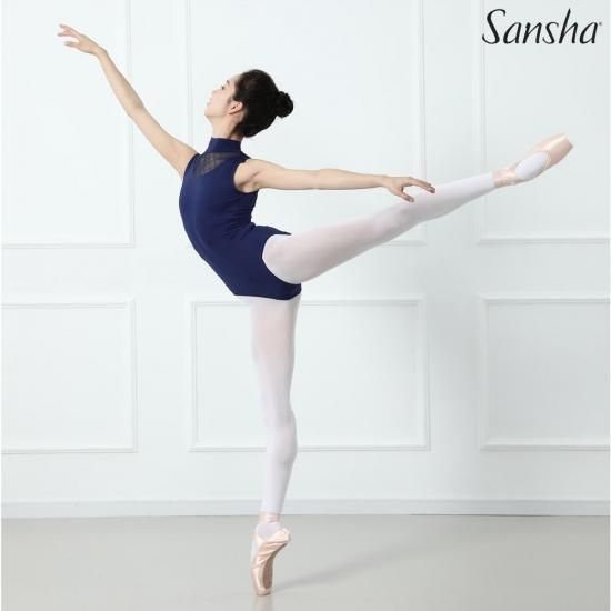 ノースリーブタイプのハイネックレオタード、背中の編柄メッシュレースの生地とドロップ型の開きが綺麗なデザインが特徴です。ハイネック部分もとても伸縮しやすい生地を使用していますので窮屈感もなく着心地の良いレオタードです。フロントライナー付
