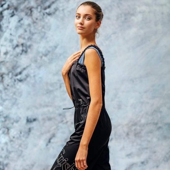 ロング丈なので楽屋でタイツの汚れを心配することがない。胸元、ウエスト、裾にコードストッパー付きのゴムで調節可