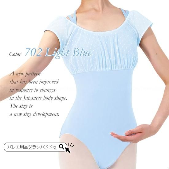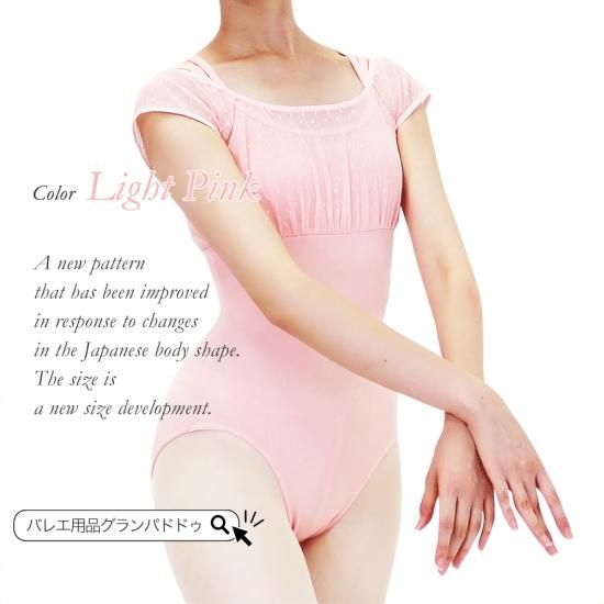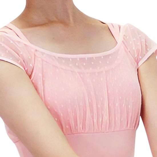 胸切替にレースと水玉ストレッチチュールを組み合わせたデザインで、成長過程のバレリーナもすっきり可愛く見せるプチプリマサイズ展開。 日本製のスムースナイロン100%素材でソフトな肌触りとやさしいフィット感が魅力。 バストパッドポケット付きで、レッスンのサポートも安心。 美しいシルエットと可愛らしいデザインでバレエがもっと楽しく快適に。 ※ 胸ポケット付