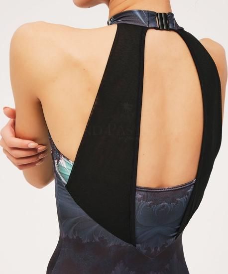 ホルターデザインは、首のラインを美しく見せる効果があり、全体のシルエットをきれいに引き立てます。背中のメッシュストラップでサポートしつつ、ダンサーの背中の美しさを際立たせます。また、背中の上部にある留め具は、動きの中でも安定したフィット感を保ちます。