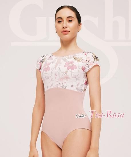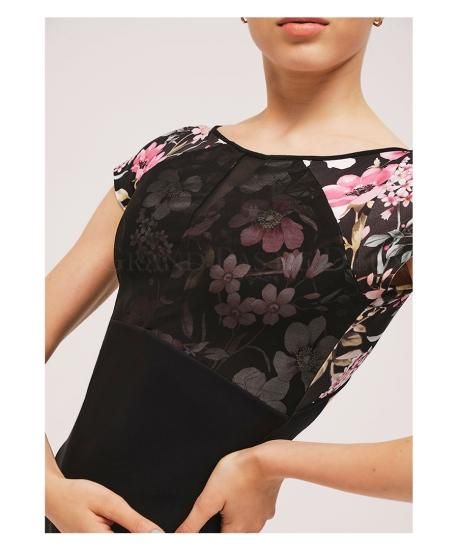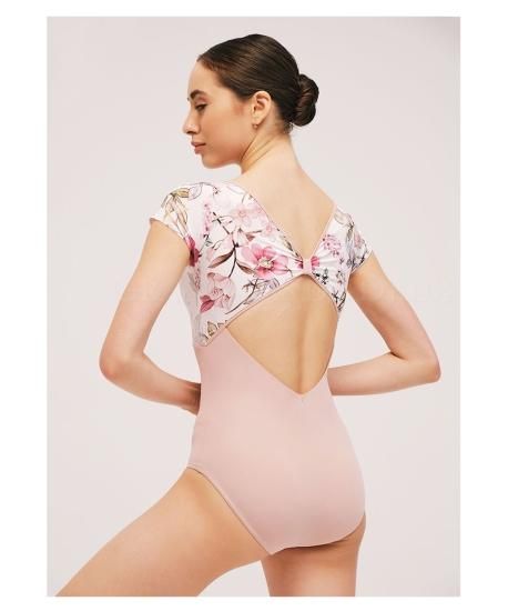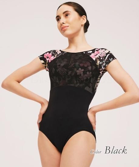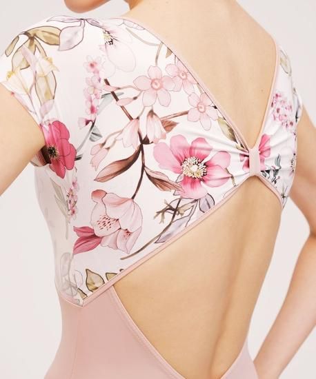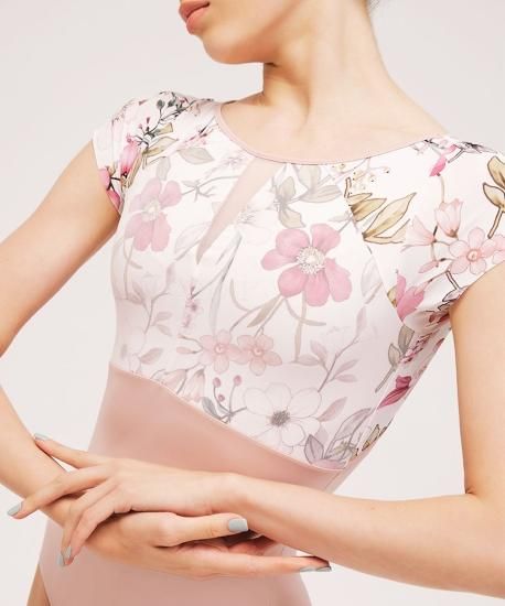 このレオタードのシアーメッシュのバストオーバーレイは、フレッシュな花柄プリントと組み合わせることで、動きの際の柔らかさや女性らしさを強調します。さらに、背中の深いV字形とダイヤモンドキーホールは、ダンサーの動きを自由にし、バレエのポーズやステップの際の柔軟性を向上させます。随所にバレエダンサーの動きやすさを追求してデザインされたレオタードです。