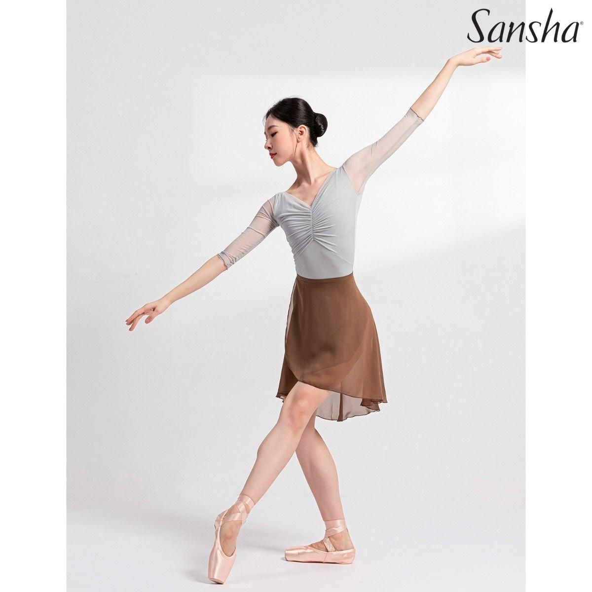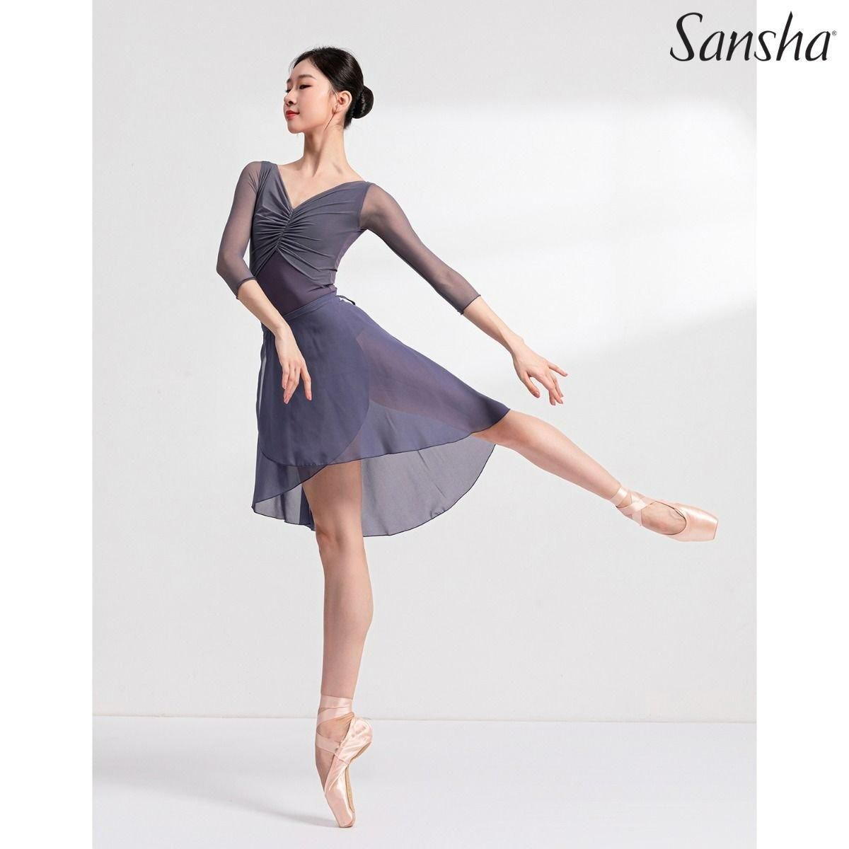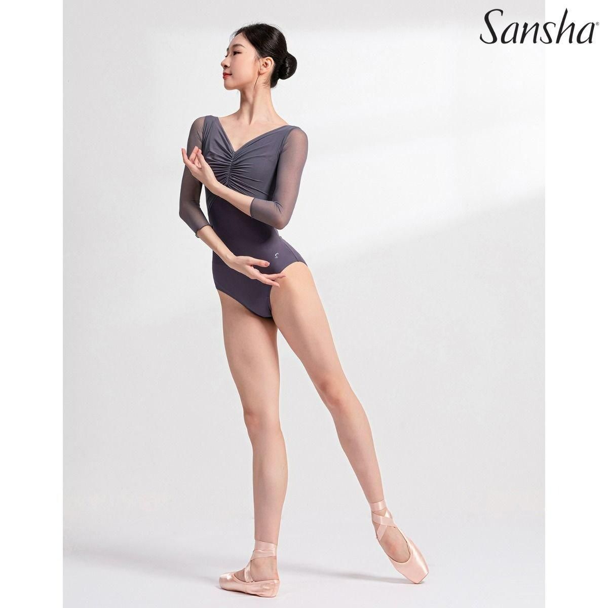 透明感のあるメッシュスリーブが軽やかさを演出し、前後ともに美しいシルエットを際立たせます。 バックスタイルも深いVカットで抜け感をプラス。ほどよいフィット感のストレッチ素材で、 レッスンから本番のリハーサルまで、快適に着用できるのが魅力です。 ●エレガントなVネックとギャザー フロントに寄せられたギャザーがデコルテを美しく見せ、 上品で女性らしい印象を与えてくれます。 ●透け感のある7分袖メッシュ 肌がほんのり見えるメッシュ生地で、涼やかかつ軽やかな印象。 二の腕をカバーしつつ、動きやすさをキープします。 ●深いVバックが後ろ姿も華やかに 背中を大きく見せすぎず、エレガントに演出。 発表会やステージ衣装としても映えるデザインです。 ●ストレッチ素材で快適なフィット感 柔らかな素材が身体に心地よくフィットし、レッスン中の汗や動きにも柔軟に対応。 長時間でも疲れにくいのが嬉しいポイント。 ●多彩なシーンで活躍 シックなカラー展開で、普段のレッスンから舞台リハーサルまで幅広く使えます。 ボトムスやシューズとも合わせやすい万能アイテムです。 サイズ|Size