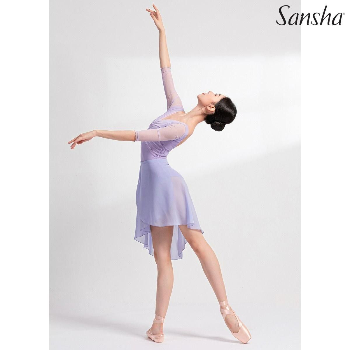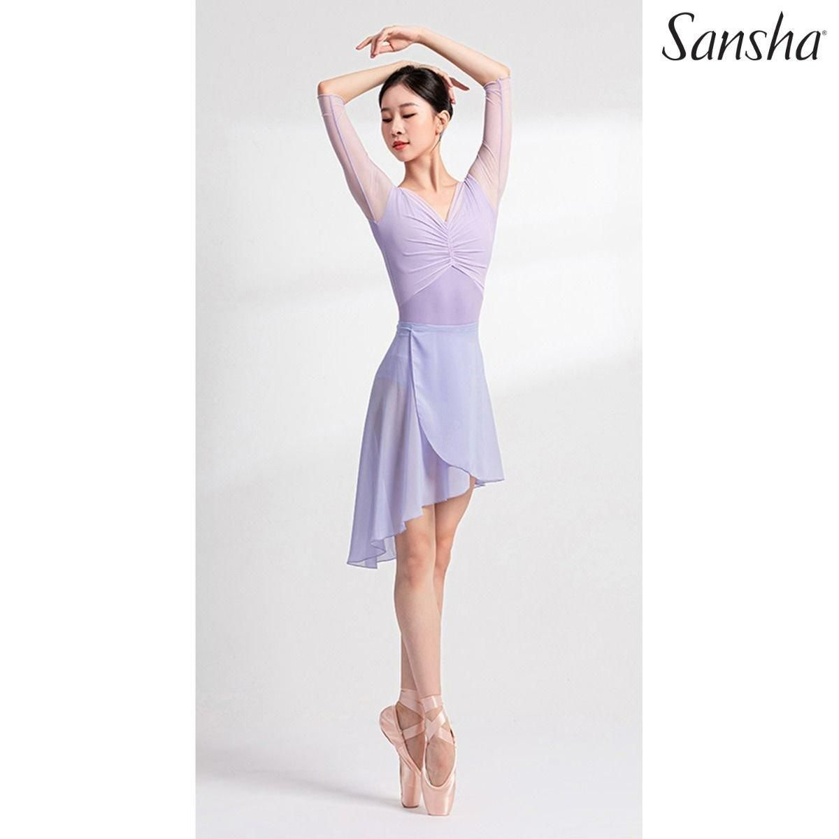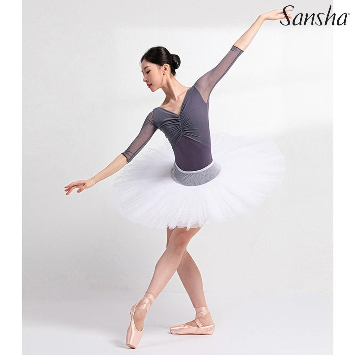 透明感のあるメッシュスリーブが軽やかさを演出し、前後ともに美しいシルエットを際立たせます。 バックスタイルも深いVカットで抜け感をプラス。ほどよいフィット感のストレッチ素材で、 レッスンから本番のリハーサルまで、快適に着用できるのが魅力です。 ●エレガントなVネックとギャザー フロントに寄せられたギャザーがデコルテを美しく見せ、 上品で女性らしい印象を与えてくれます。 ●透け感のある7分袖メッシュ 肌がほんのり見えるメッシュ生地で、涼やかかつ軽やかな印象。 二の腕をカバーしつつ、動きやすさをキープします。 ●深いVバックが後ろ姿も華やかに 背中を大きく見せすぎず、エレガントに演出。 発表会やステージ衣装としても映えるデザインです。 ●ストレッチ素材で快適なフィット感 柔らかな素材が身体に心地よくフィットし、レッスン中の汗や動きにも柔軟に対応。 長時間でも疲れにくいのが嬉しいポイント。 ●多彩なシーンで活躍 シックなカラー展開で、普段のレッスンから舞台リハーサルまで幅広く使えます。 ボトムスやシューズとも合わせやすい万能アイテムです。 サイズ|Size