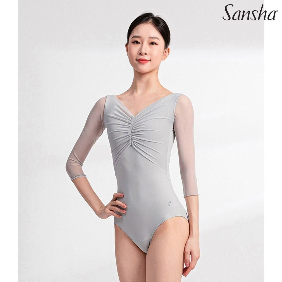 胸元に寄せられた優美なギャザーと、V字に開いたネックラインが目を引く7分袖のレオタードです。