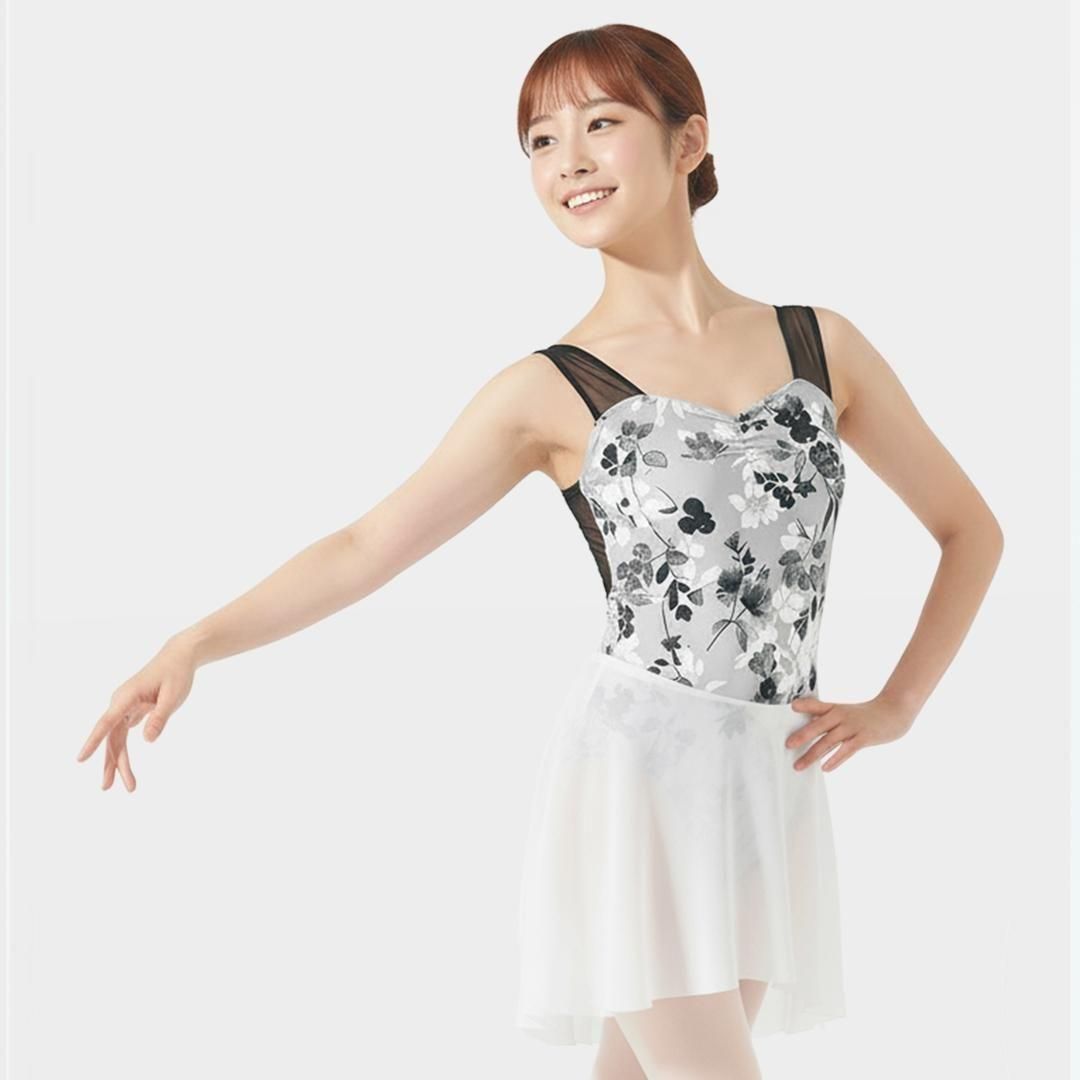 胸元のやわらかなハートカットと、肩に添う黒のシアーストラップが、すっきりとした印象と動きの軽さを引き立てます。 日本製ならではの丁寧な縫製と、優れたストレッチ性で踊りを引き立てます。 身頃は吸汗速乾2wayトリコットを採用。汗をかいても肌離れがよく、長時間のレッスンでも快適な着心地をキープします。 バストカップ差し込み口付き、アンダーバストゴムで安定のフィット感 【おすすめポイント】 ・ハートカット×メッシュストラップの洗練されたデザイン ・吸汗速乾素材で汗ばむ季節も快適に ・UPF50+のUVカットで紫外線対策も万全 ・日本製のしなやかな2wayトリコット素材を使用 ・バストポケット付きでインナーの着用も安心 1.美しく映える、華やか×シンプルなバランス 大胆すぎないモノトーンの花柄と、ほどよく肌を透かす肩のメッシュ素材が上品なアクセントに ジュニアの成長段階にも、大人の洗練された動きにも美しくマッチします。 2. 汗をかくシーンでも快適さが続く吸汗速乾素材+UV対策 吸水性と速乾性に優れた素材で、動いた後の汗による冷えを軽減。 UPF50+で、屋外移動や夏場のスタジオ通いも安心して過ごせます。